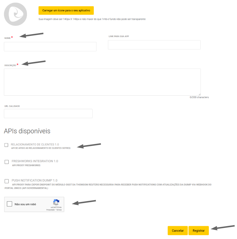 2. Preencha os campos obrigatórios e selecione as APIs que seu App irá consumir e no final clicar no botão Registrar